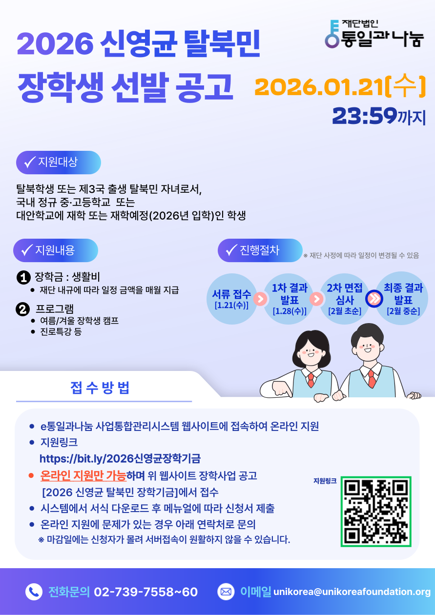 [통일과나눔] 2026 신영균 탈북민 장학기금 장학생 선발 공고(~1/21)
