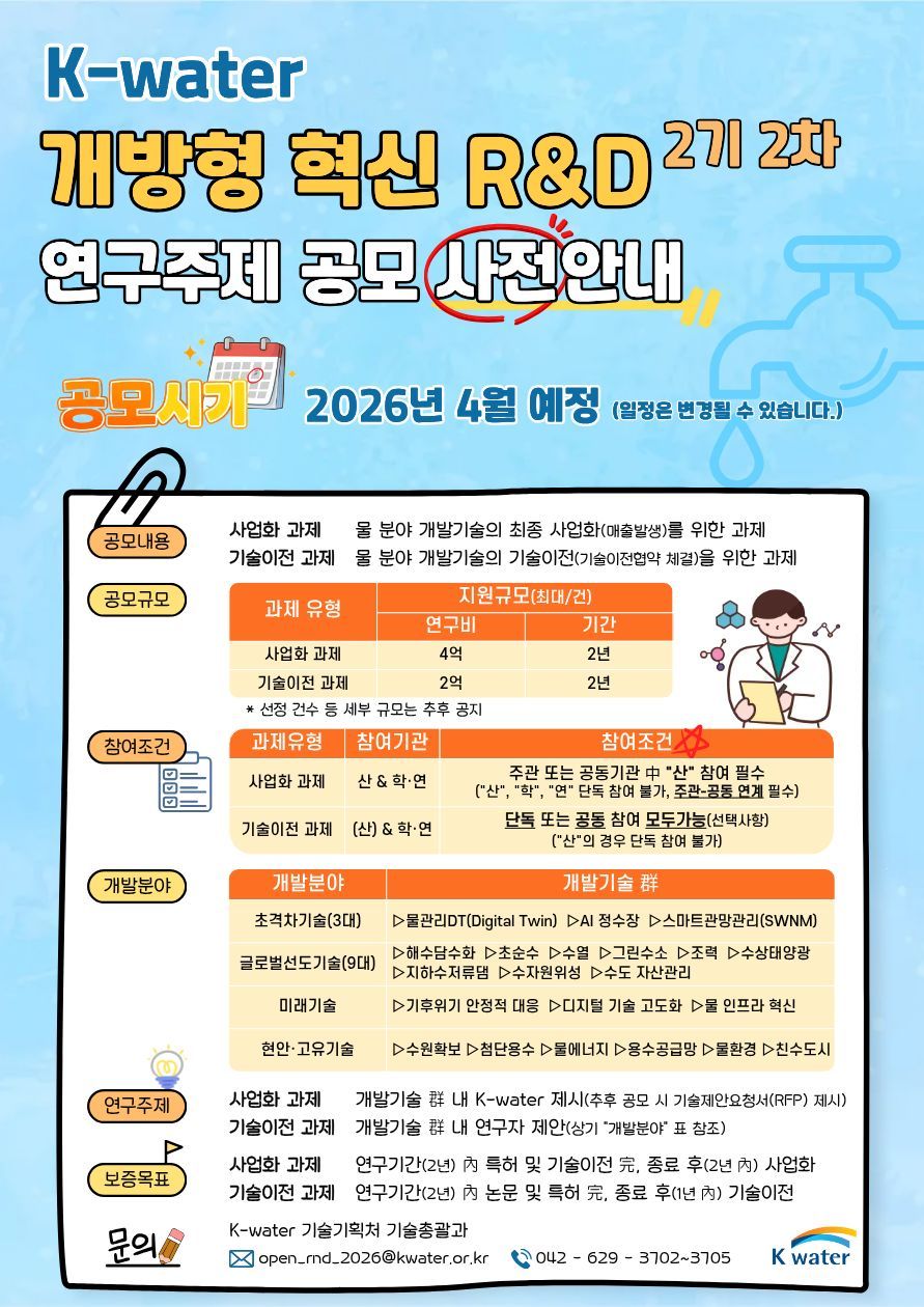 [한국수자원공사] (사전안내) 2026년 개방형 연구과제 공모 예정 안내